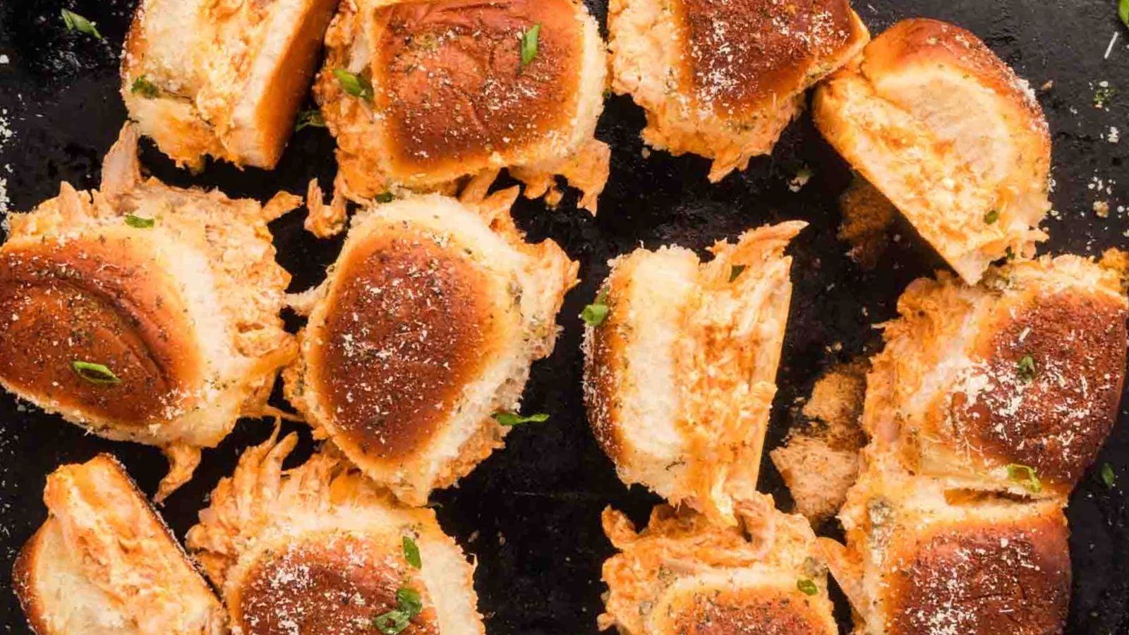Mini sandwiches filled with buffalo chicken.