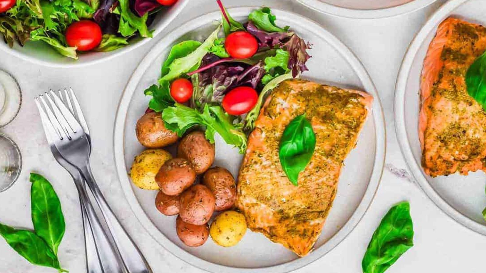 A plate with baked salmon topped with a basil leaf, baby potatoes, and a mixed green salad with cherry tomatoes. Silver forks and fresh basil leaves are on the side.