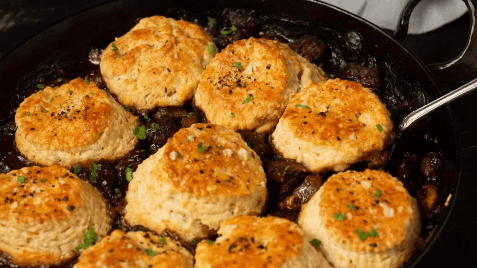 A cast iron skillet holds a dark stew topped with round golden biscuits, with a metal spoon resting at the side.