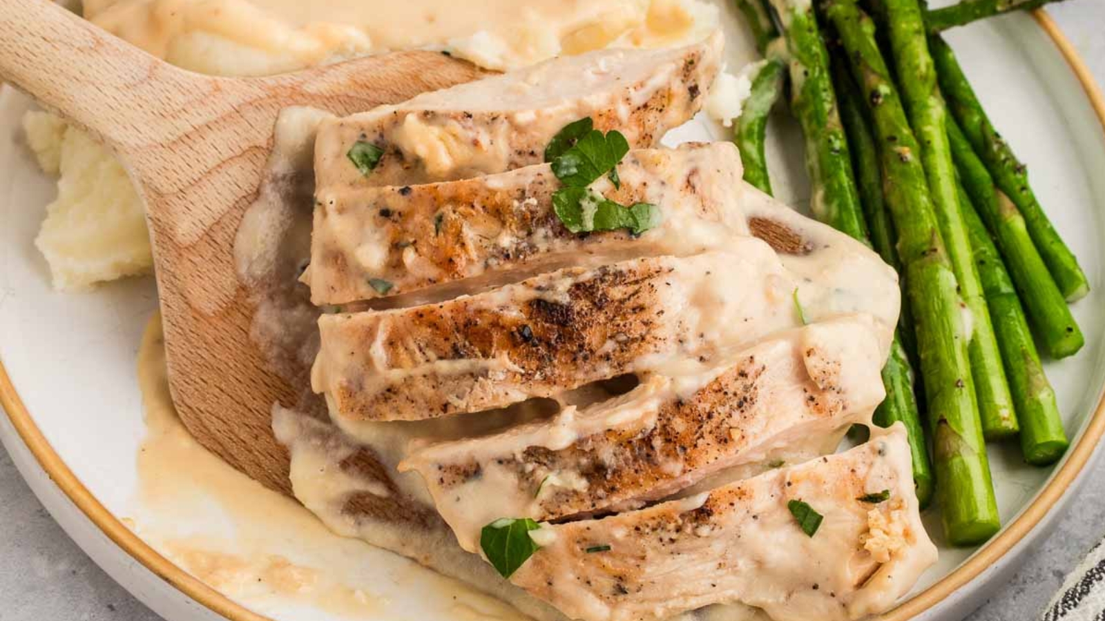Sliced chicken breast with creamy sauce served over mashed potatoes, garnished with parsley, and a side of roasted asparagusโ€”a comforting favorite among classic Meat Dinners.