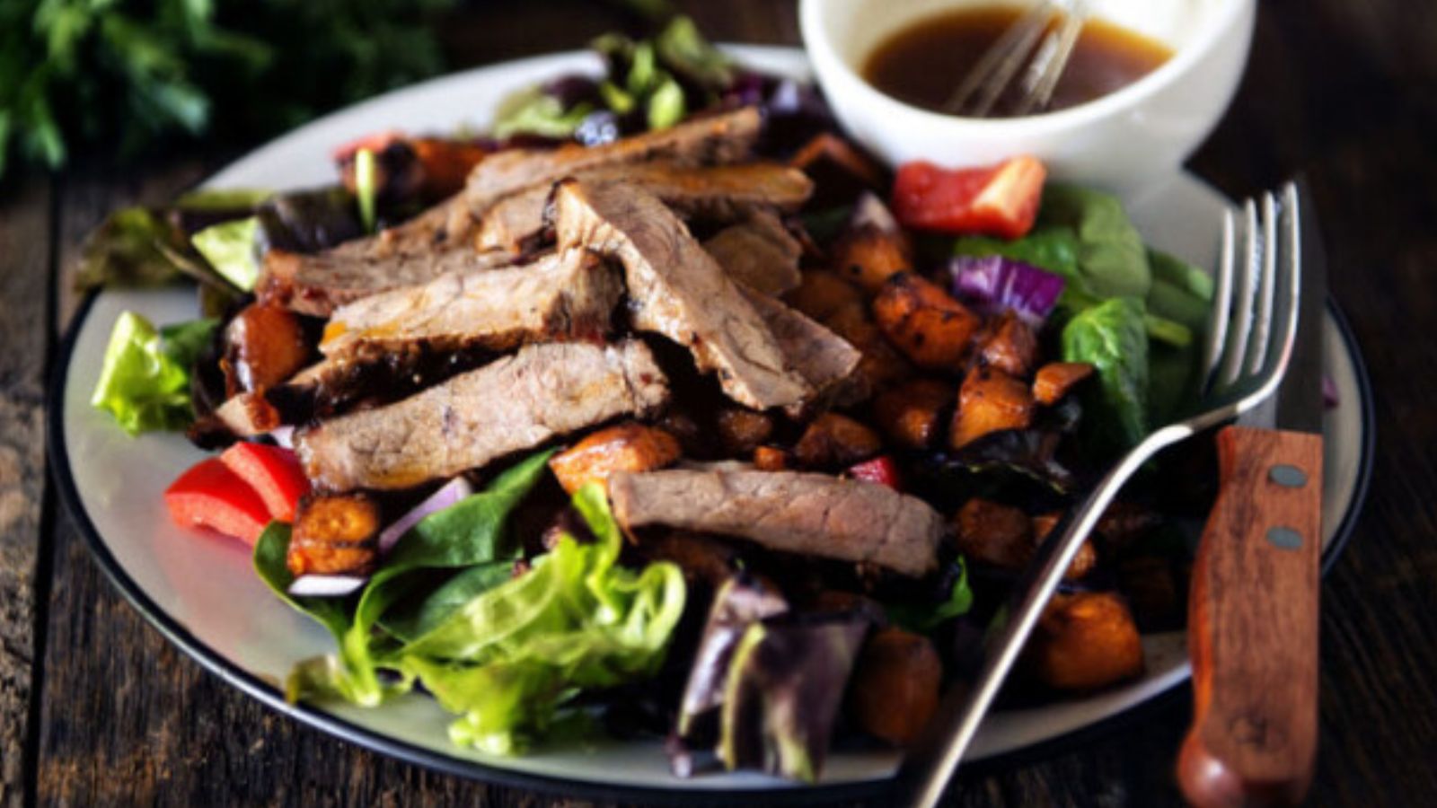 Strip steak salad with sweet potatoes and chile lime dressing.
