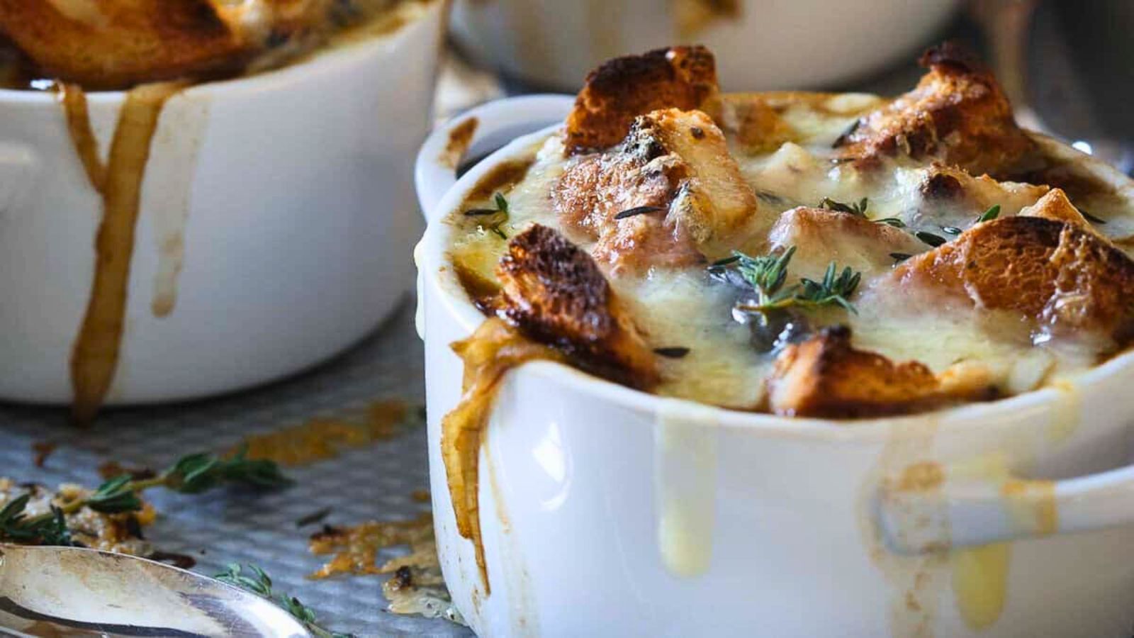Individual white bowls filled with French onion soup, topped with toasted bread cubes, melted cheese, and garnished with fresh thyme. Some cheese and soup have spilled over the sides.