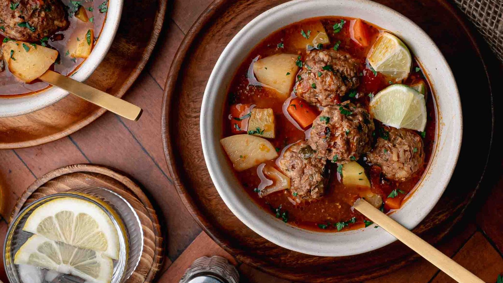 A bowl of meatball soup with potatoes, carrots, and herbs beside a drink with lemon slices on a wooden table.