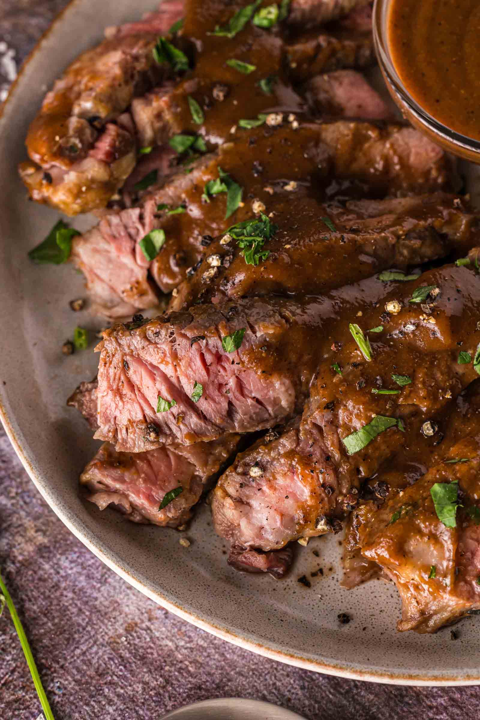 Sliced medium-rare steak topped with a1 sauce, garnished with chopped herbs, served on a plate with extra sauce in a small bowl.