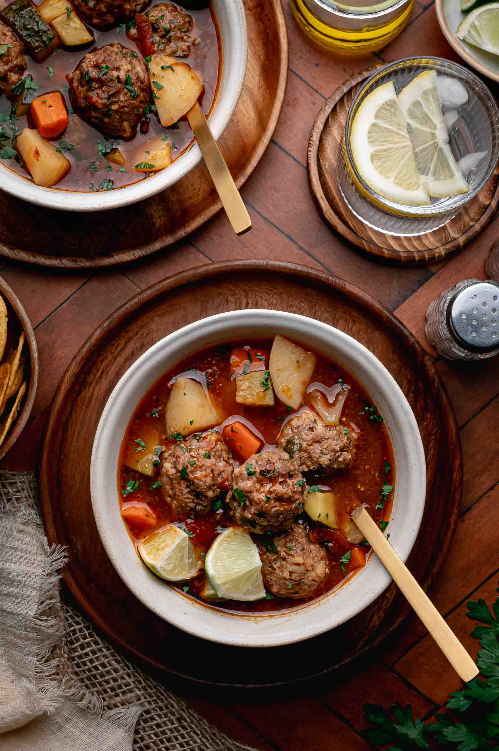 Albondigas soup is a Mexican meatball soup made with beef meatballs, rice, herbs, potatoes, vegetables, and a tomato-based broth.