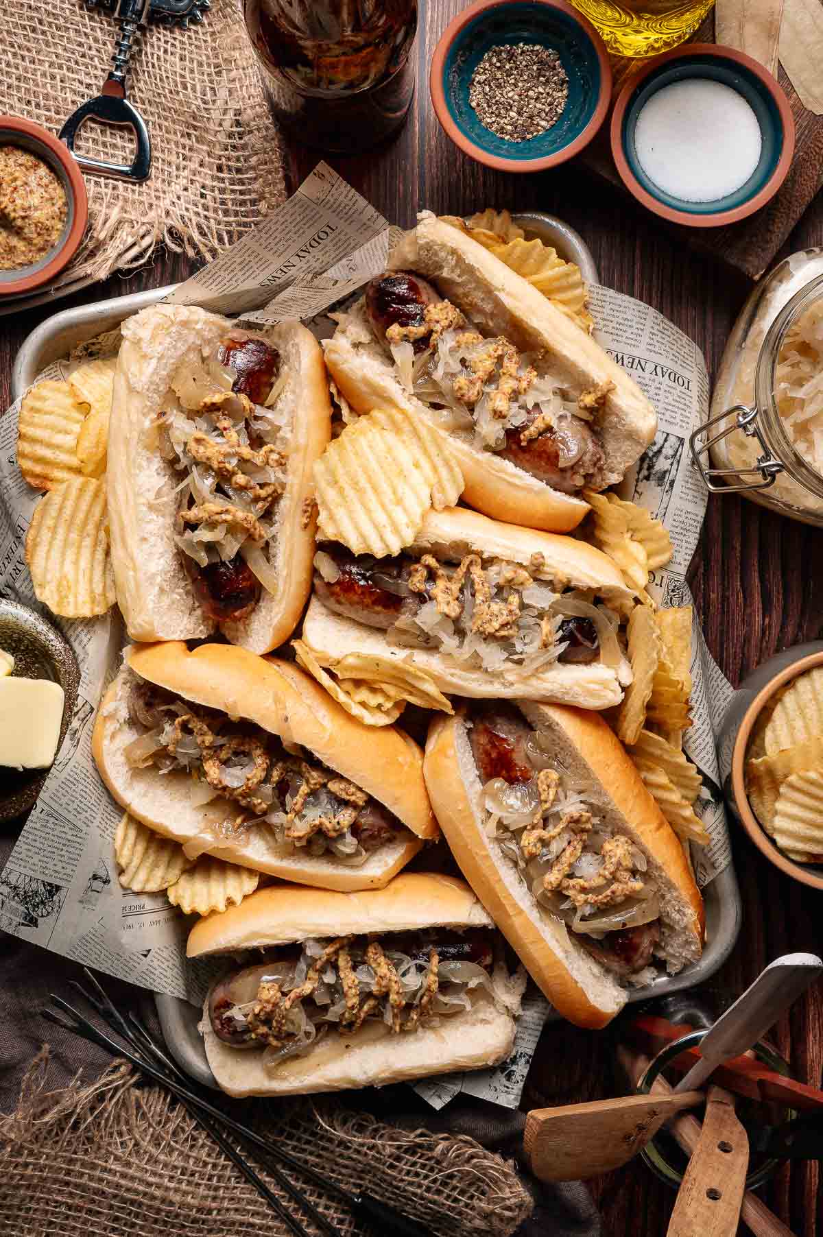 - Serve brats in buns with onions, a spoonful of cooking liquid, mustard, and sauerkraut.