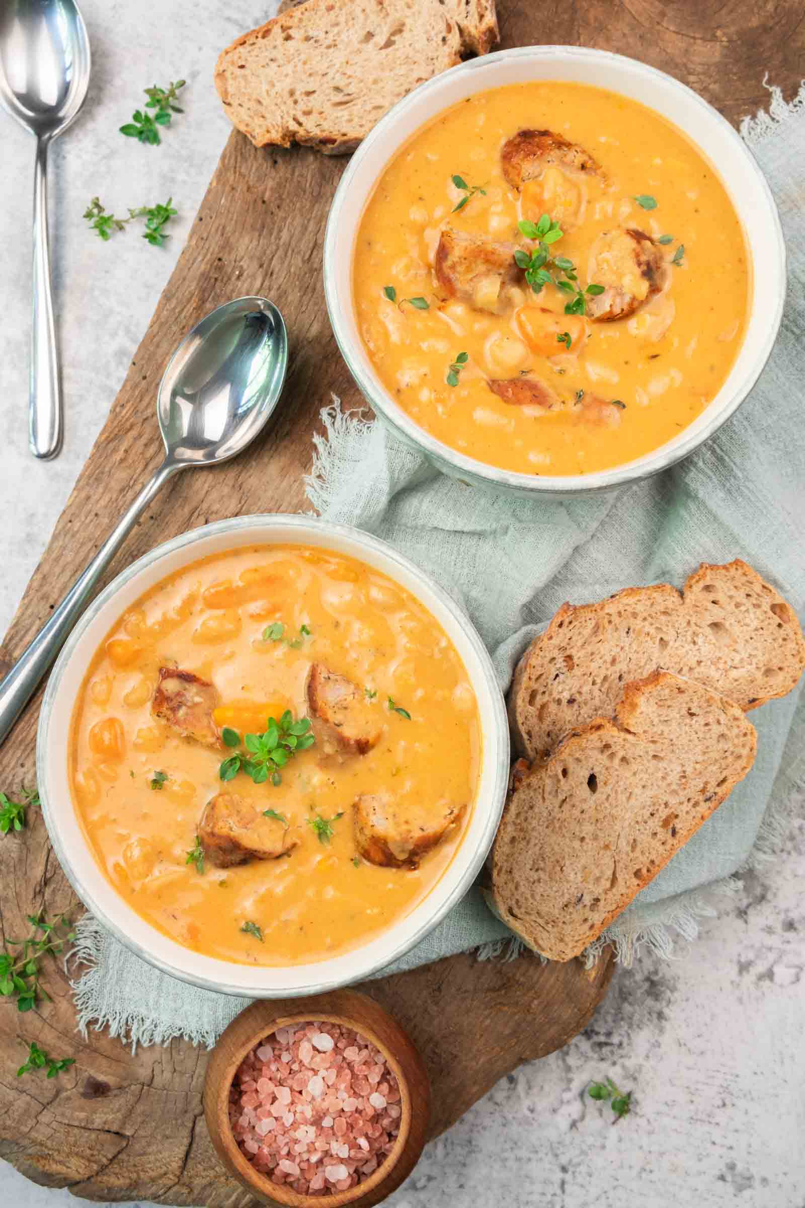 Stir in smoked paprika, dried thyme, and fresh thyme sprigs. Cook 1 minute until fragrant. - Simmer the soup