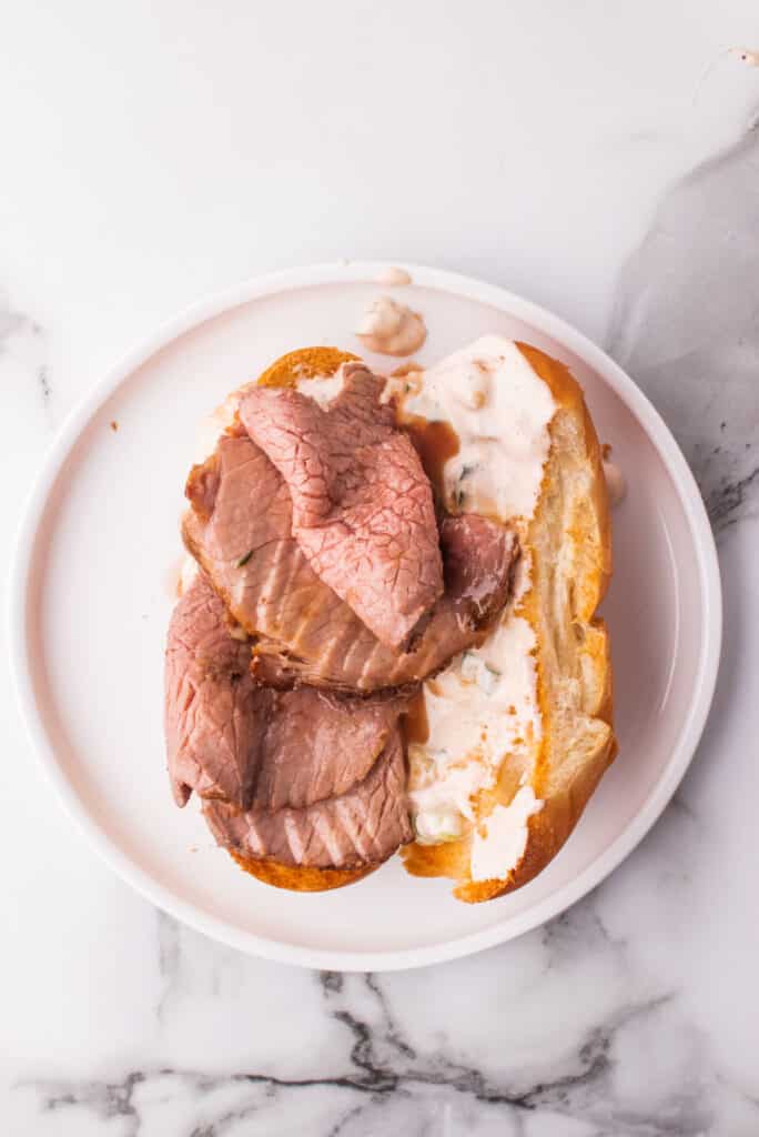 - Dunk slices of the beef into the hot au jus and layer onto the prepared rolls.