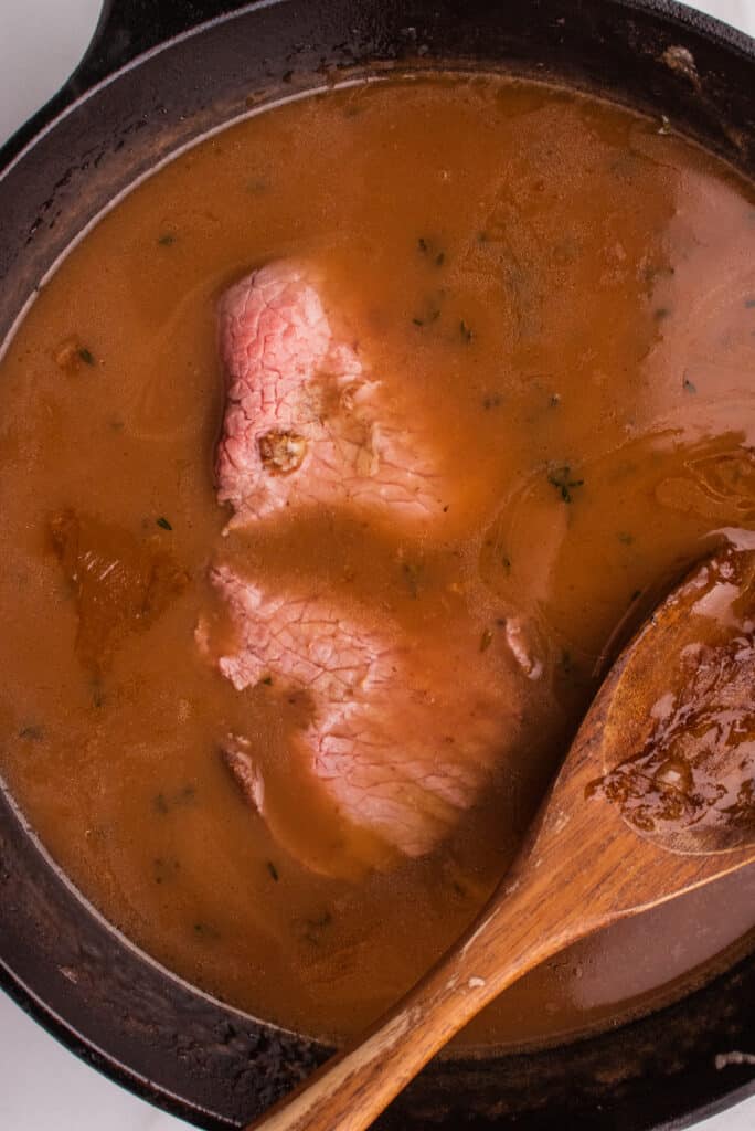 An electric slicer is the best tool to get paper-thin slices of beef for this French dip au jus recipe. If you don’t have a slicer, here’s how you can get thin slices: