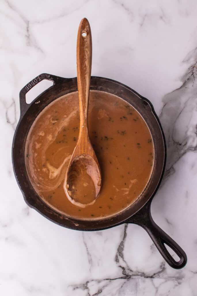 Slowly whisk in the broth from the drip pan in a slow stream, whisking as you go to avoid lumps. Add the thyme and bring it to a simmer when all the broth is incorporated.
