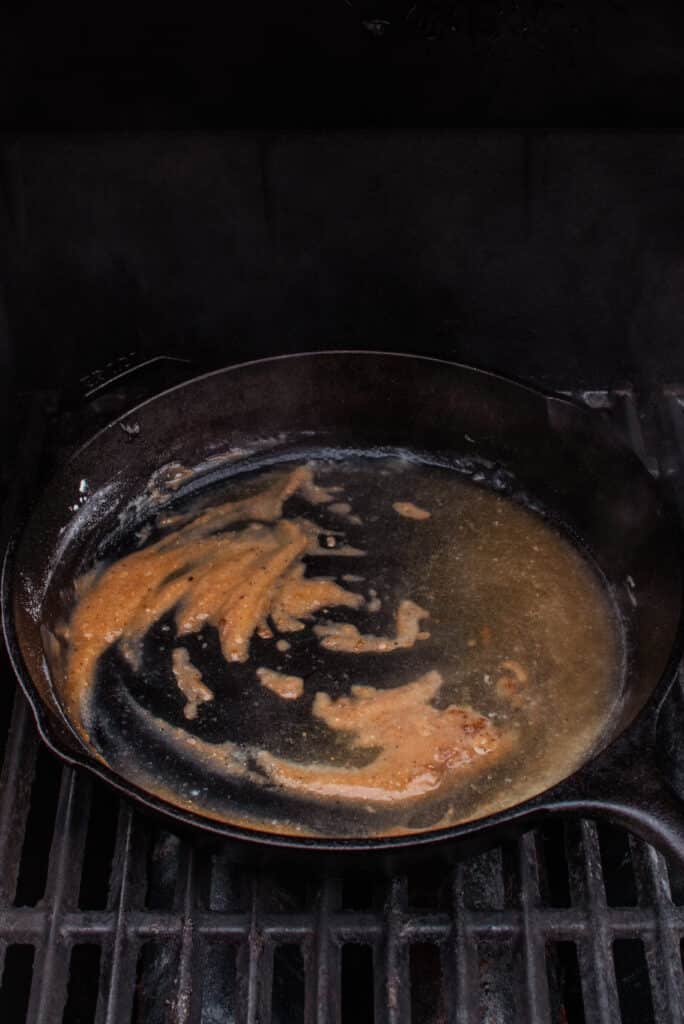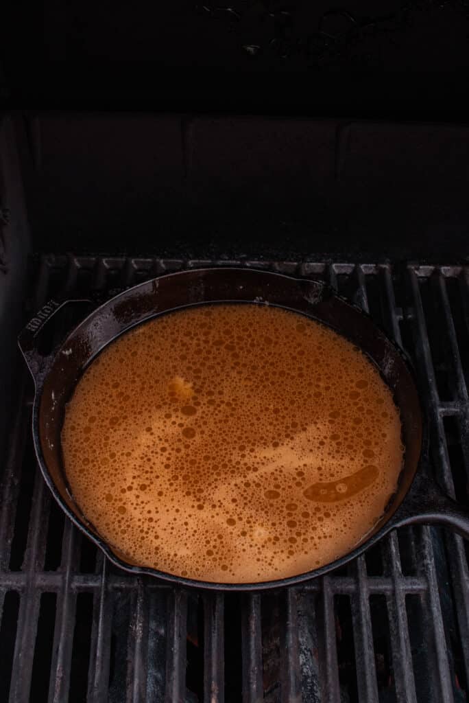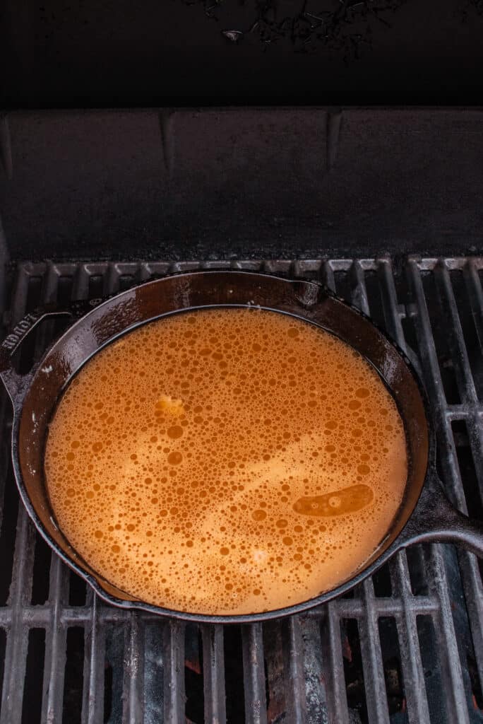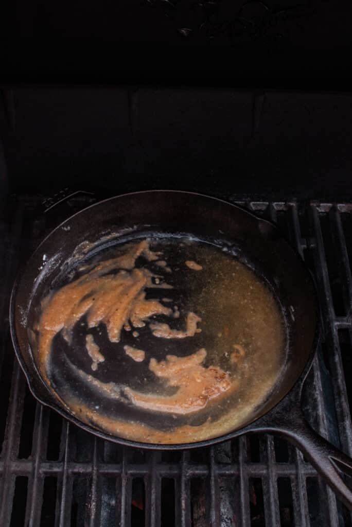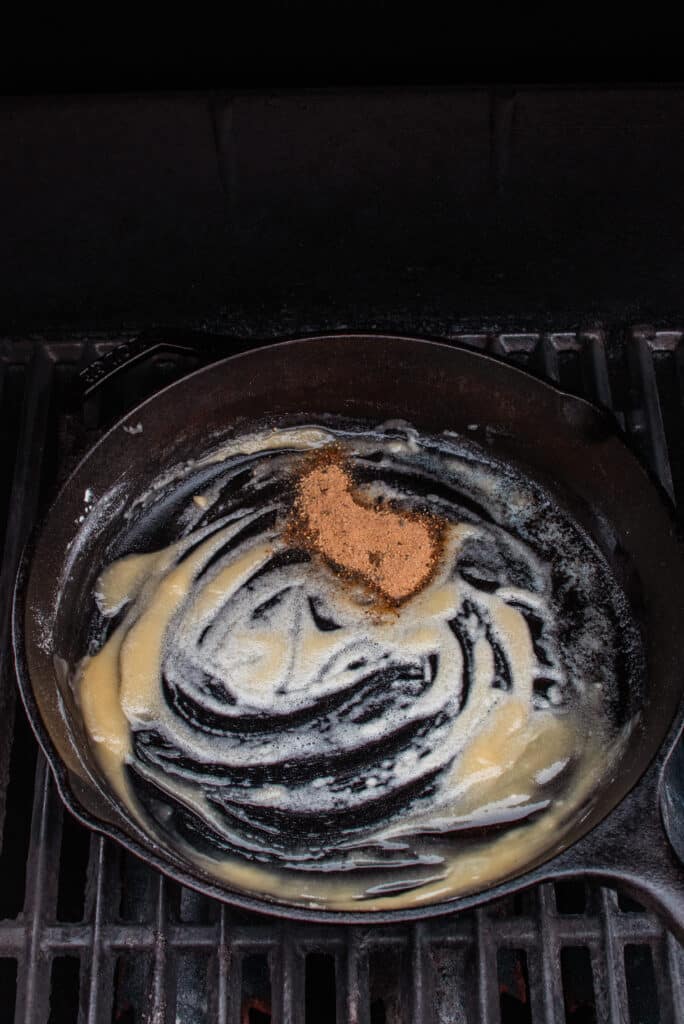 - Place a large cast iron skillet on the grill over direct heat to get the pan warm.