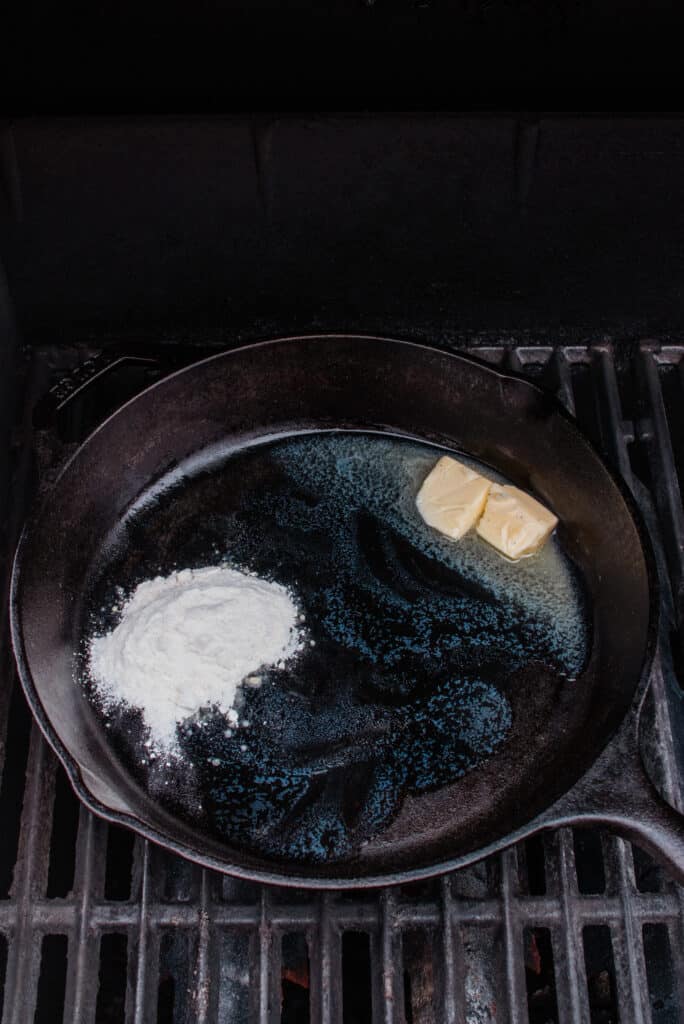 Add the butter and let it melt, then whisk in the flour and mix well. Cook the flour and butter for 1 minute.