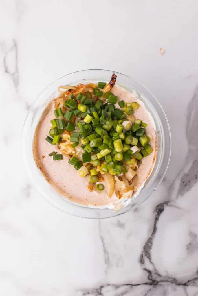 - Fold in the chopped onion, garlic and scallions.6 scallions