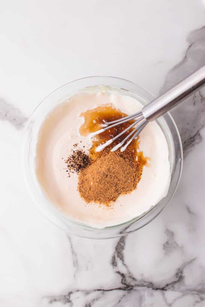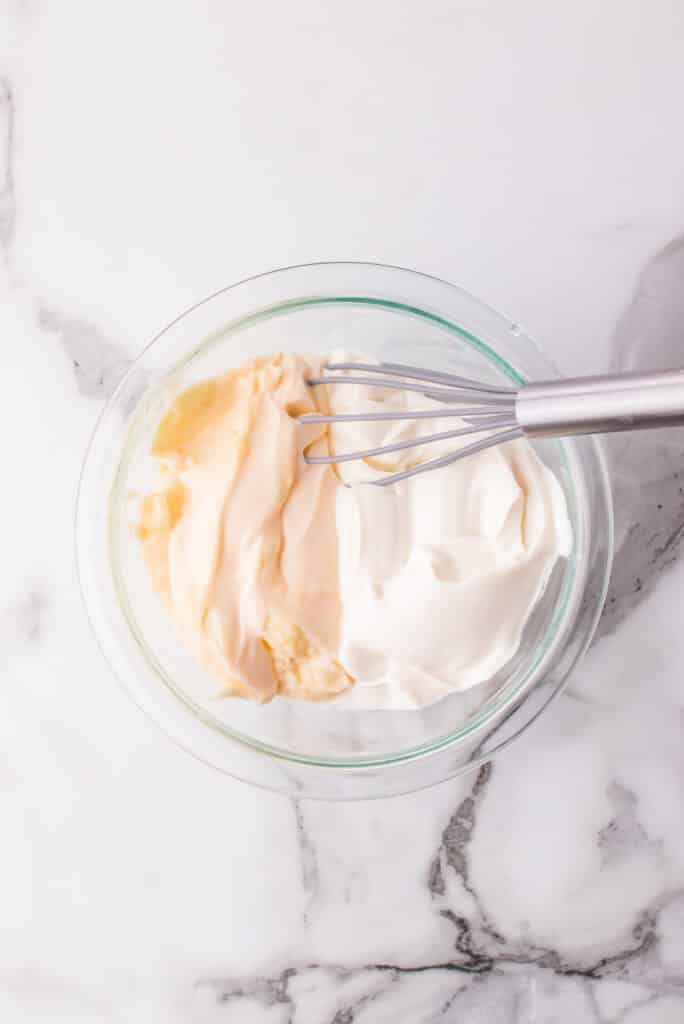 - Whisk the sour cream and mayo in a bowl.1 ½ cups sour cream, 1 cup mayo