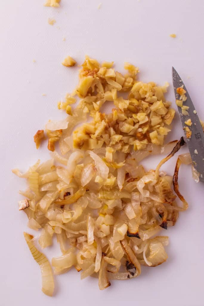 Squeeze the garlic from the papery shells and mince. Finely chop the onions.