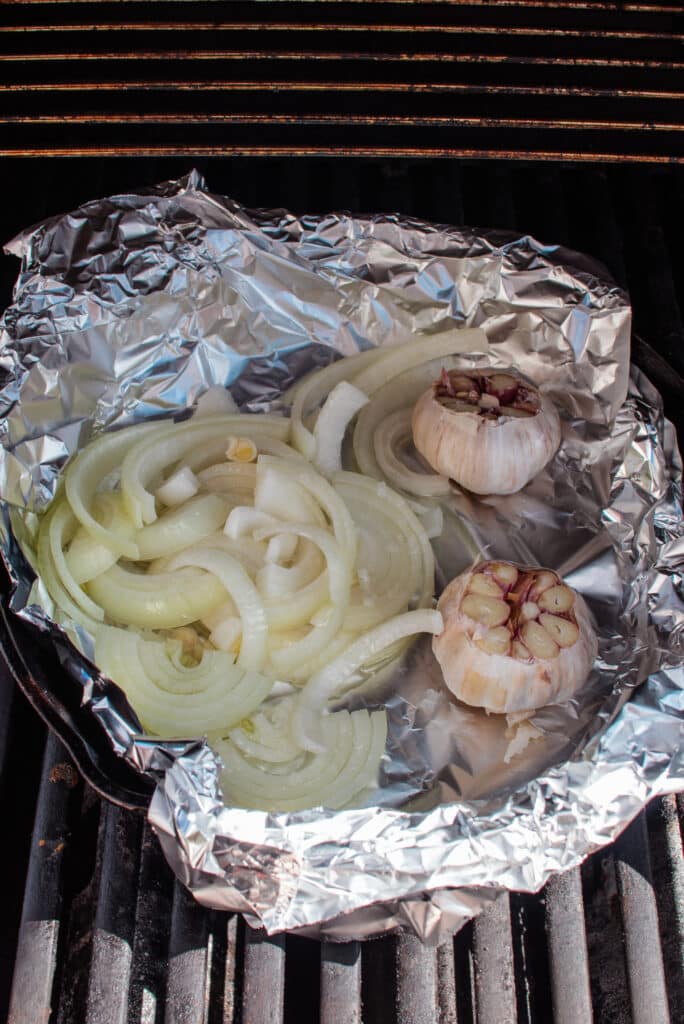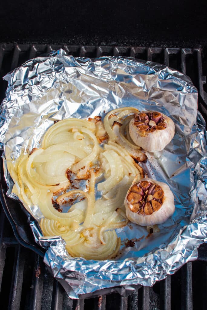 - Add the onion and garlic to an aluminum foil pan and smoke for 35 to 40 minutes, until tender