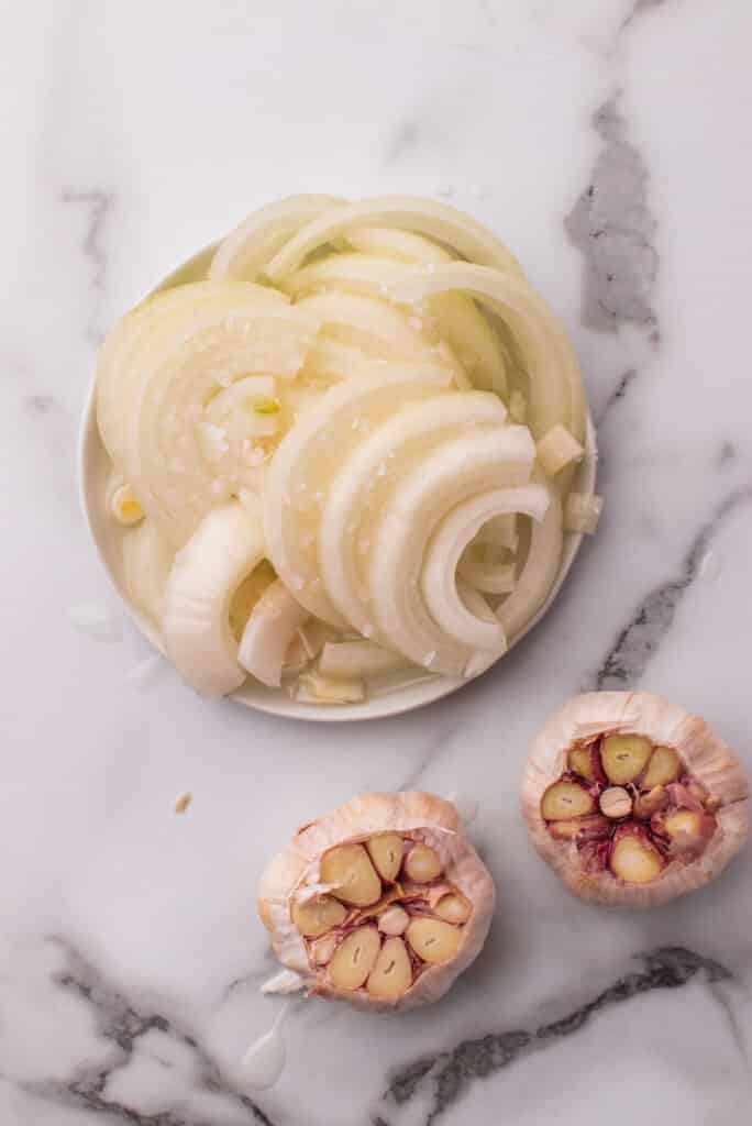 Meanwhile, make the onion dip. Start by coating the onions in oil and season them with a pinch of salt. Cut the top off another head of garlic and drizzle it with oil. Add the onion and garlic to an aluminum foil pan and smoke for 35-40 minutes or until tender. Remove the onions and garlic from the smoker and let them cool.