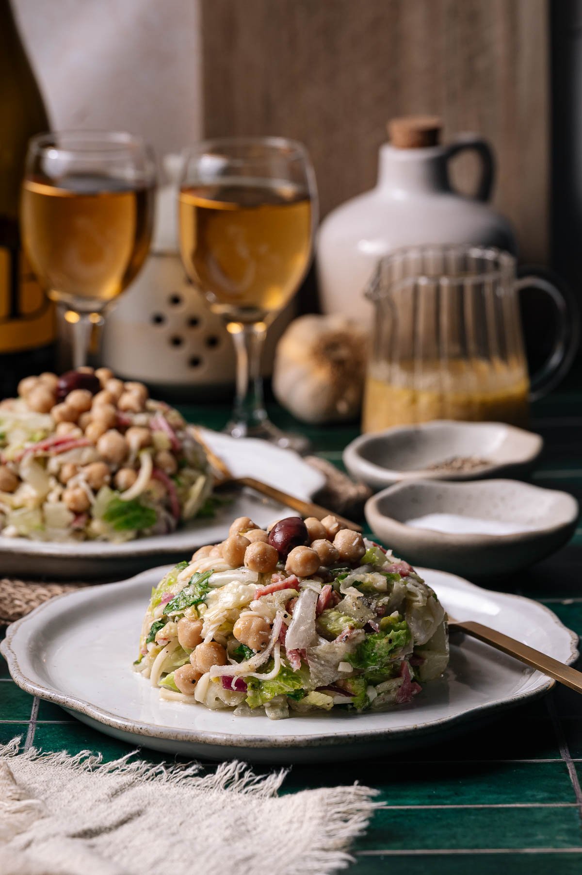 When you need a dose of sunny Southern California weather, this is the salad to make. La Scala’s chopped salad is a Beverly Hills legend for a reason: finely chopped lettuce, salami, mozzarella, chickpeas, all tossed in a garlicky Parmesan vinaigrette. It makes the GirlCarnivore rotation because that charcuterie situation keeps it interesting, and our version adds one move that takes it further—marinating those chickpeas in the dressing for 20 minutes first.