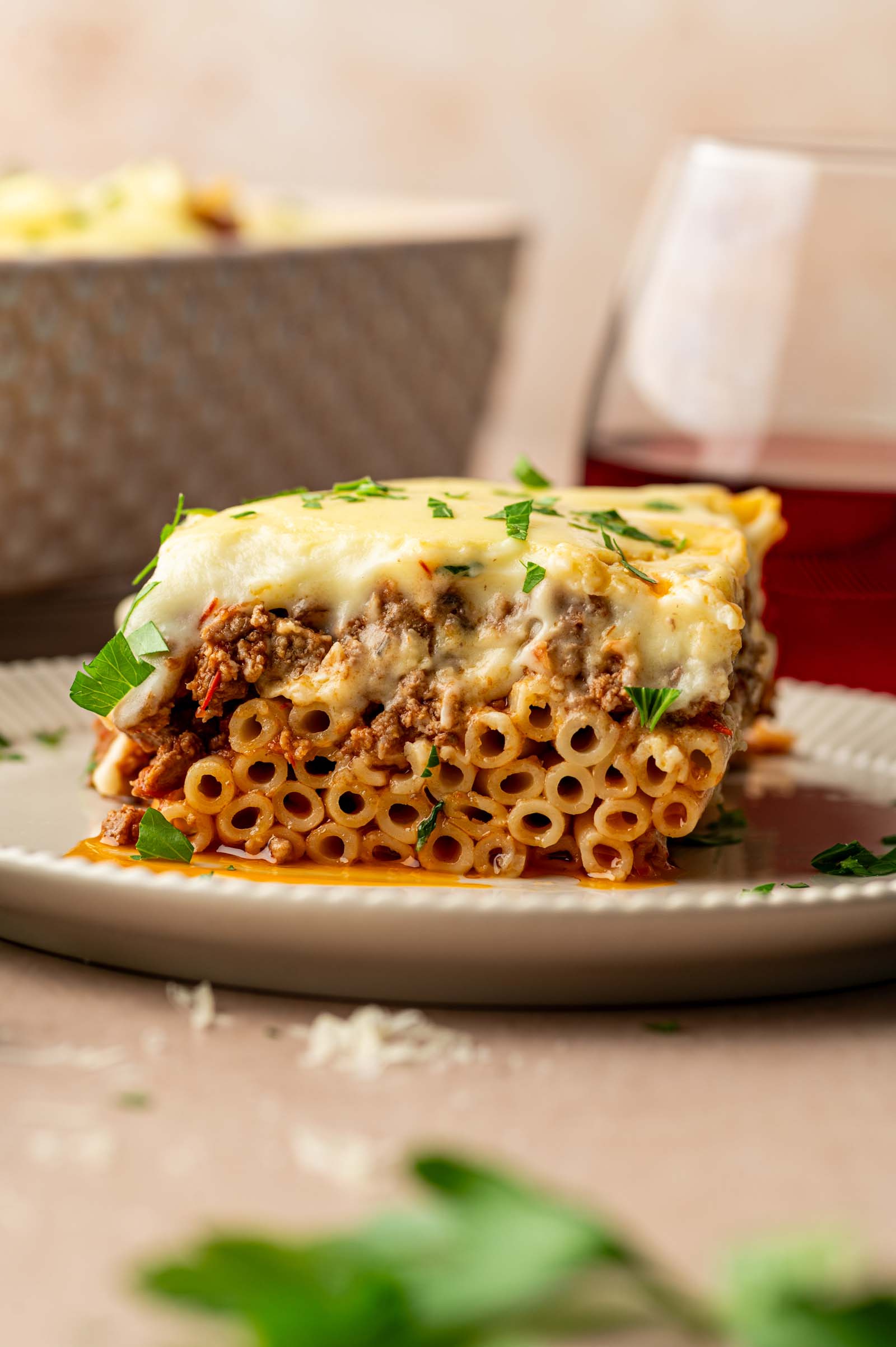 A slice of baked pastitsio casserole with ground lamb, tomato sauce, and béchamel on a plate, garnished with chopped parsley. A glass of red beverage and casserole dish in the background.